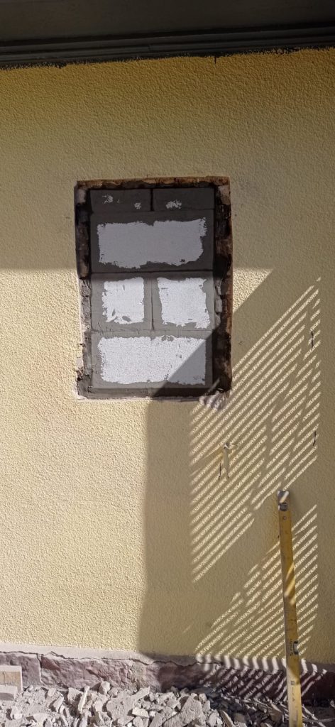 Im Rahmen von Sanierungsmaßnahmen führen wir für nachfolgende Fliesenleger Arbeiten folgenden vorbereitenden Bauarbeiten durch: Alte Fenster ausbauen und ausmauern der Fensteröffungen mit Porenbetonsteinen und im Anschluss Überspachteln als Untergrund für nachfolgenden Putz.
