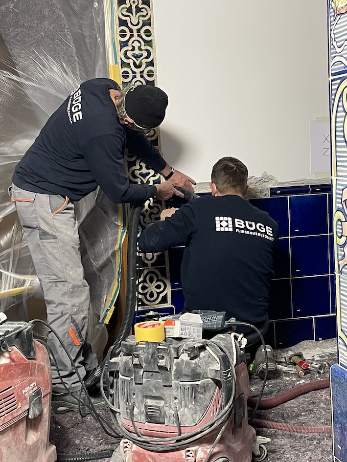 Bei einer Restaurierung von Majolika werden Fliesenarbeiten wie folgt durchgeführt: Sicherung von historischen Keramikfliesen. Schadensfreier Ausbau von historischen Majolika Fliesen, Formstücken, Dekorplatten und Bordüren. Zuvor Kartografierung durch Spezialisten.
