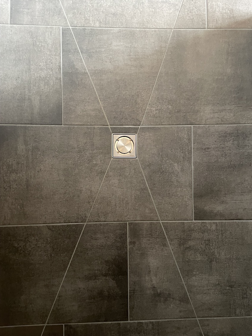 Bei diesem Projekt werden folgende Fliesenlegearbeiten durchgeführt: Duschboden aus feinsteinzeug Fliesen 30/60 R10B im Gefälle zum Bodenablauf von Geberit mit Gehrungsschnitten auf dem Vierfeld Gefälleestrich aus zementärem Schnellezementmörtel. Abdichtung 2 K schon mouth RS300 und Dichtbändern Schomburg Aso 2000.