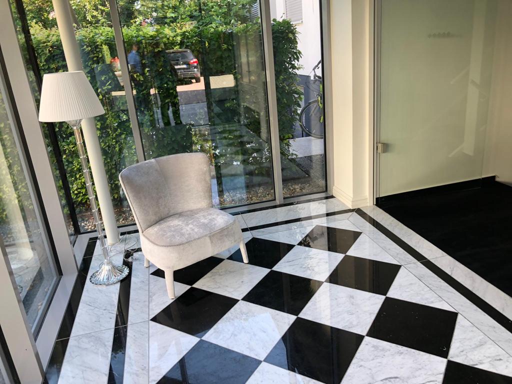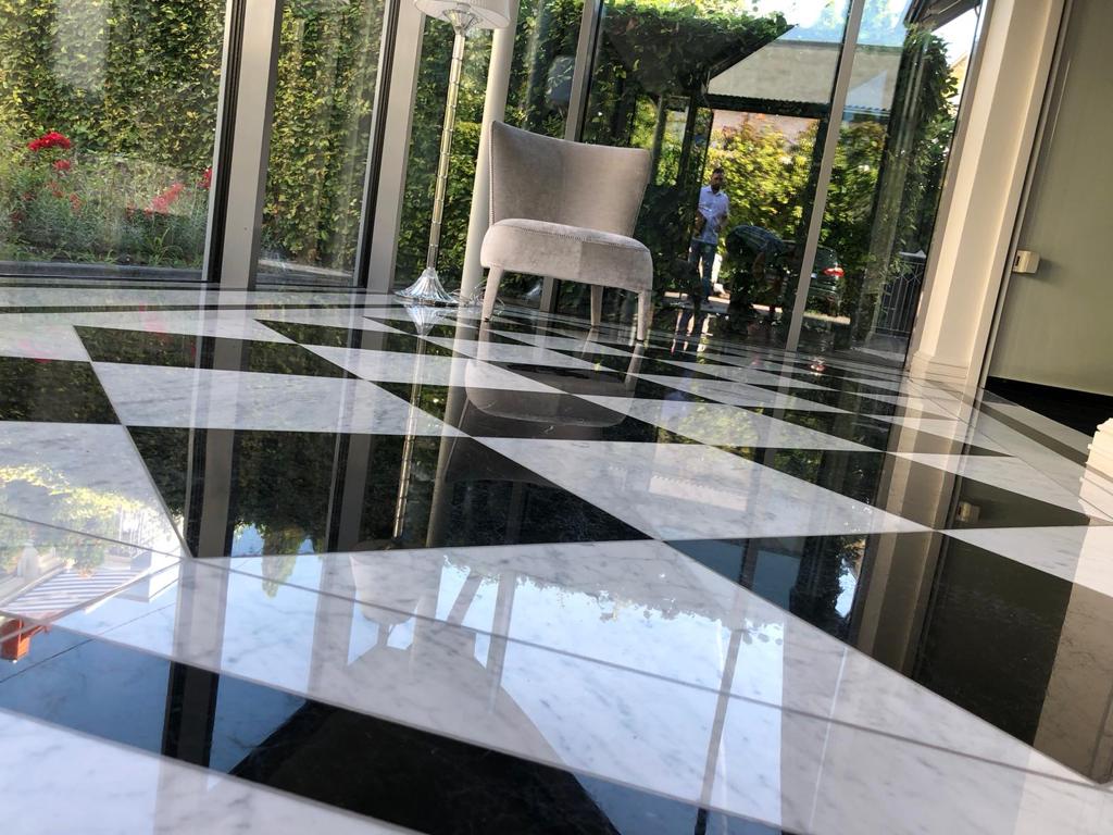 Marmorboden, Schachbrett verlegt mit Randfriesen nach dem Einbau geschliffen und poliert. Das Schachbrett Muster besteht aus schwarzem Nero Marquina und weissem Carrara Marmor.